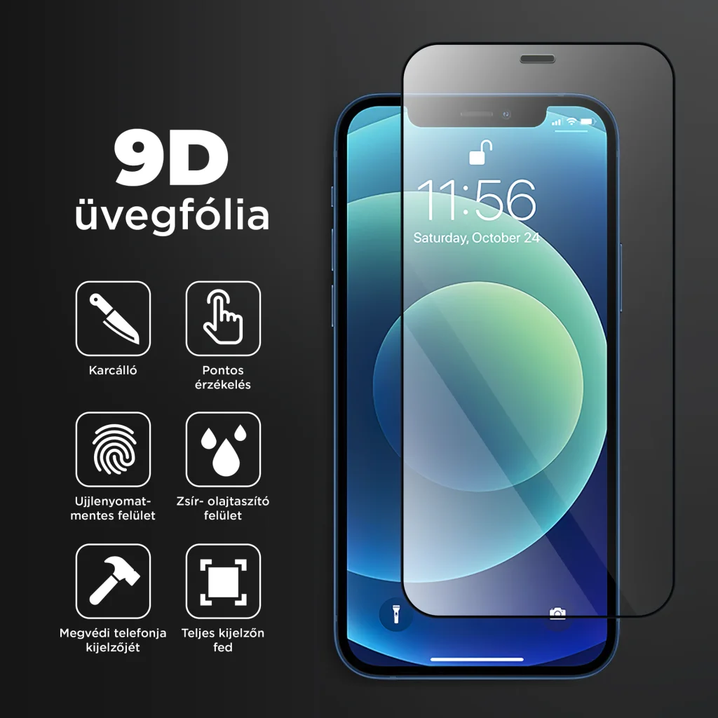 Minőségi 9D 0.33mm 9H fekete keretes, teljes felületén ragasztott üvegfólia. Megvédi telefonja kijelzőjét a karcoktól, kisebb külső behatásoktól. Zsír-olajtaszító (oleofób) felülete ujjlenyomat mentes használatot biztosít. A csomagban megtalálható a felhelyezéshez szükséges nedves-száraz törlő, illetve a poreltávolító matrica is. Pontos kialakításának és minőségi anyaghasználatnak köszönhetően nem sötétít kijelzőjén, az érzékelést pedig nem akadályozza.