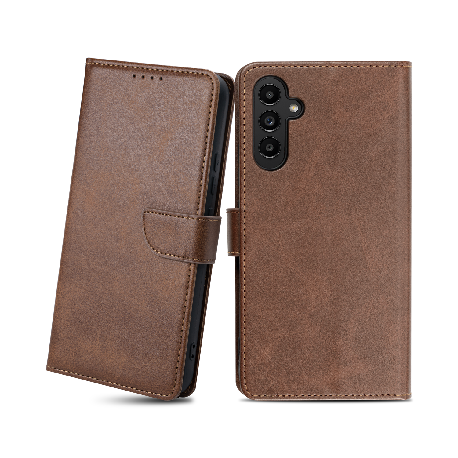 Samsung Galaxy A13 4G mágneses PU bőr fliptok kártyatartóval sötétbarna Alphajack