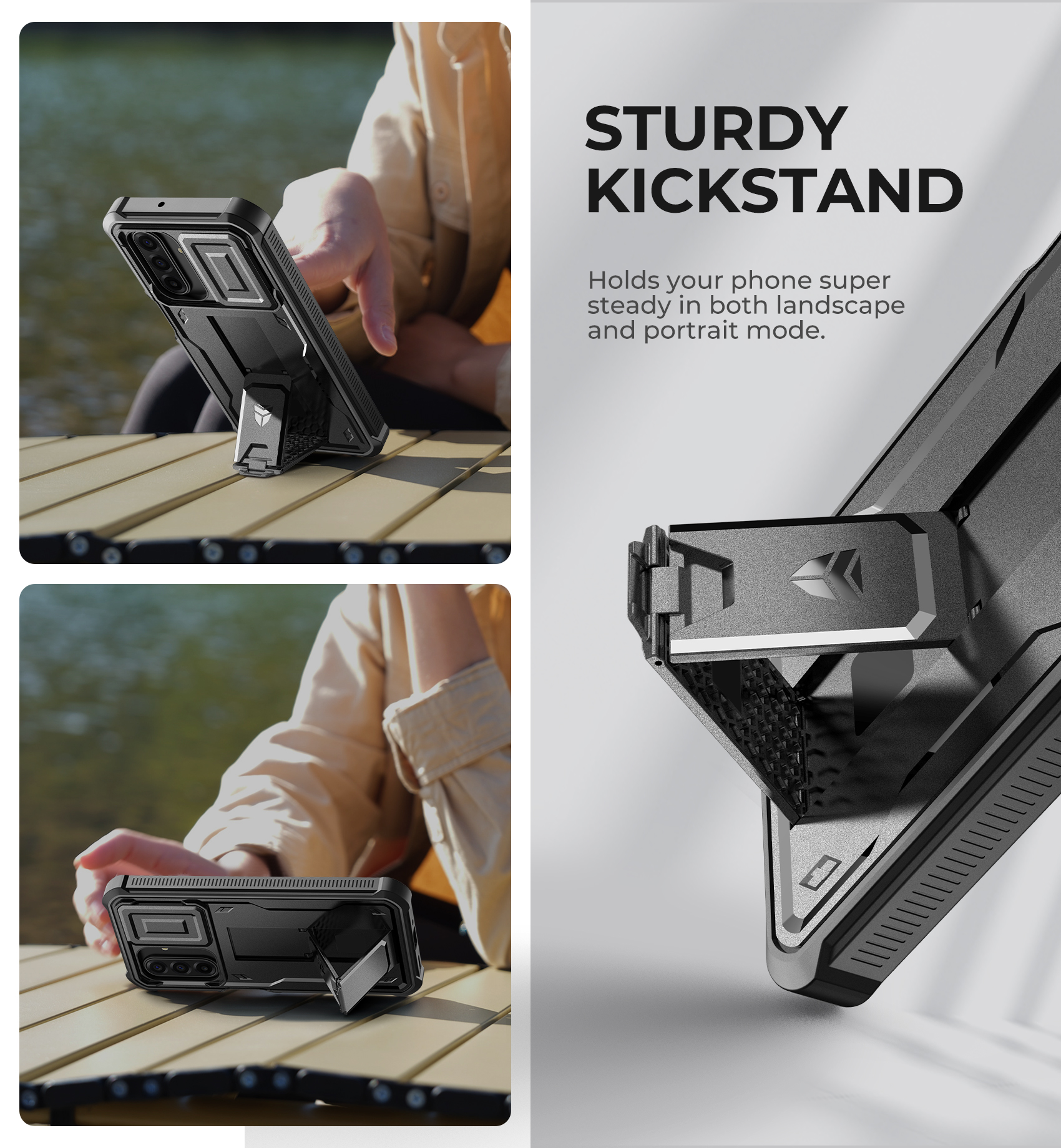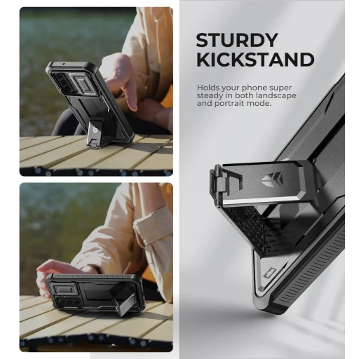 - Stabil kitámasztó: A hátlapon található, robusztus kitámasztó rendkívül stabilan tartja telefonját, legyen szó álló vagy fekvő módról. Ez a funkció tökéletes videónézéshez, videóhívásokhoz vagy böngészéshez anélkül, hogy kézben kellene tartania a telefont.