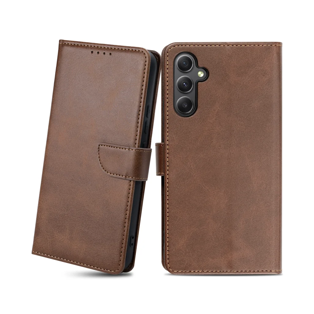 Samsung Galaxy A34 5G mágneses PU bőr fliptok kártyatartóval sötétbarna Alphajack