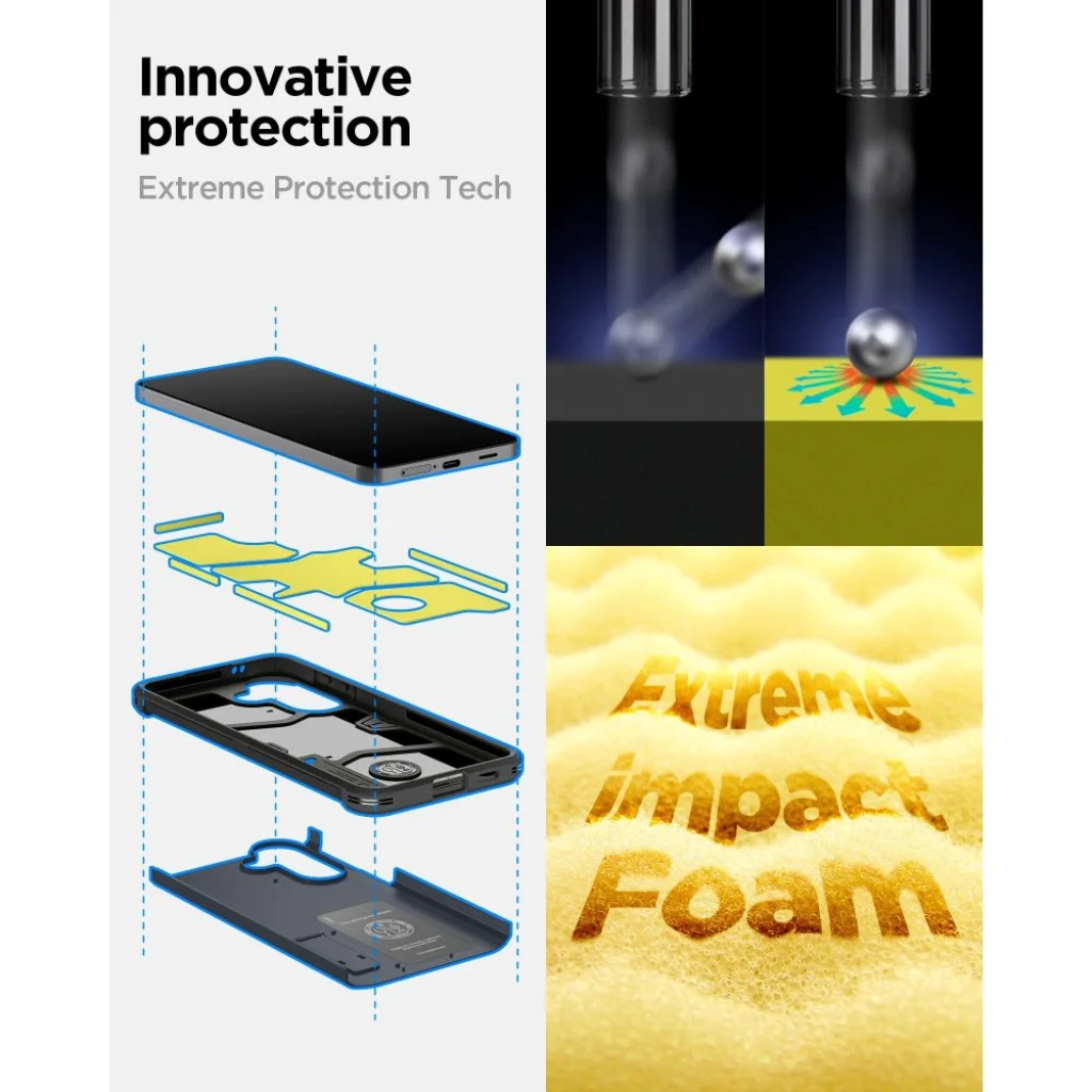A hibrid kialakítás kemény polikarbonát külső réteget és rugalmas TPU belsőt ötvöz. Az Air Cushion technológia a sarkokban hatékonyan elnyeli az ütések során keletkező energiát, míg a tok belsejében található technológiai habréteg többrétegű védelmet nyújt az ütések ellen. Az Extreme Protection Tech katonai szintű védelmet garantál, így telefonja még a legkeményebb körülmények között is védve van.