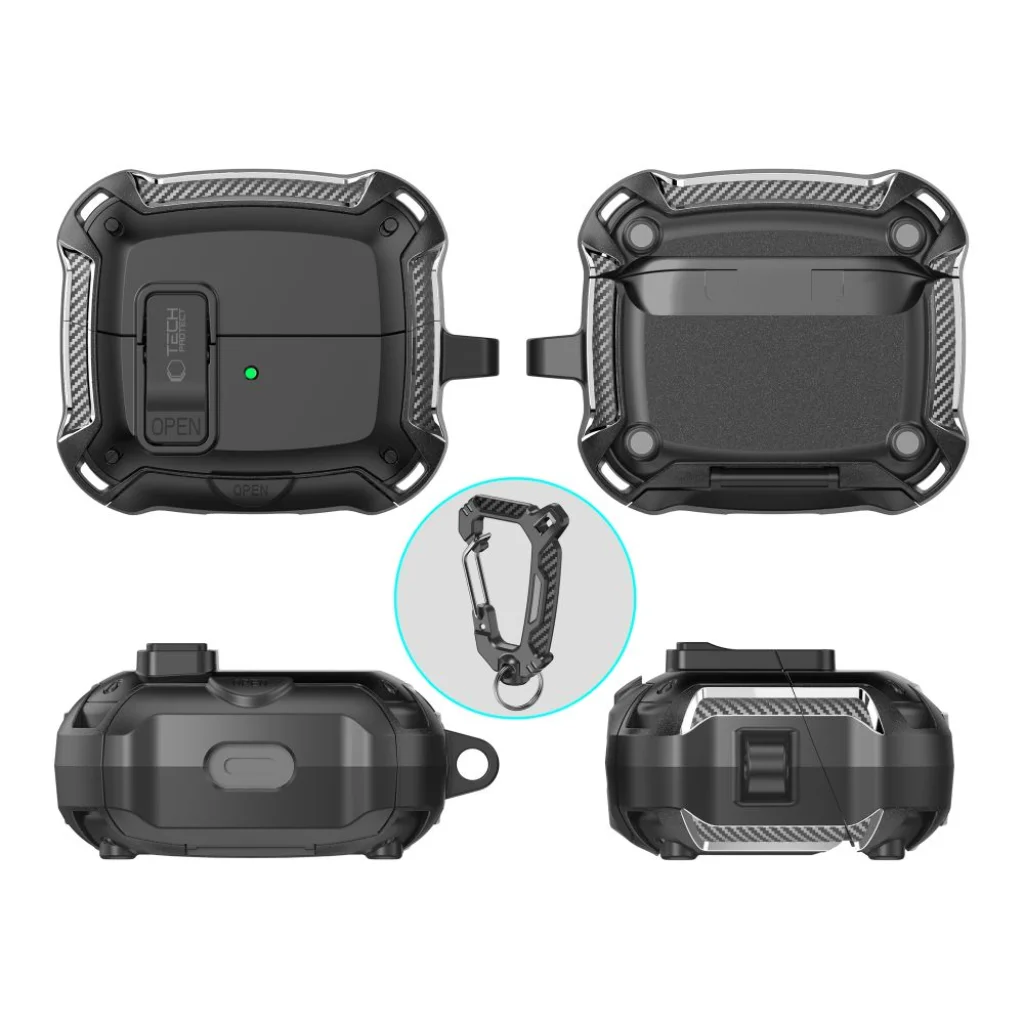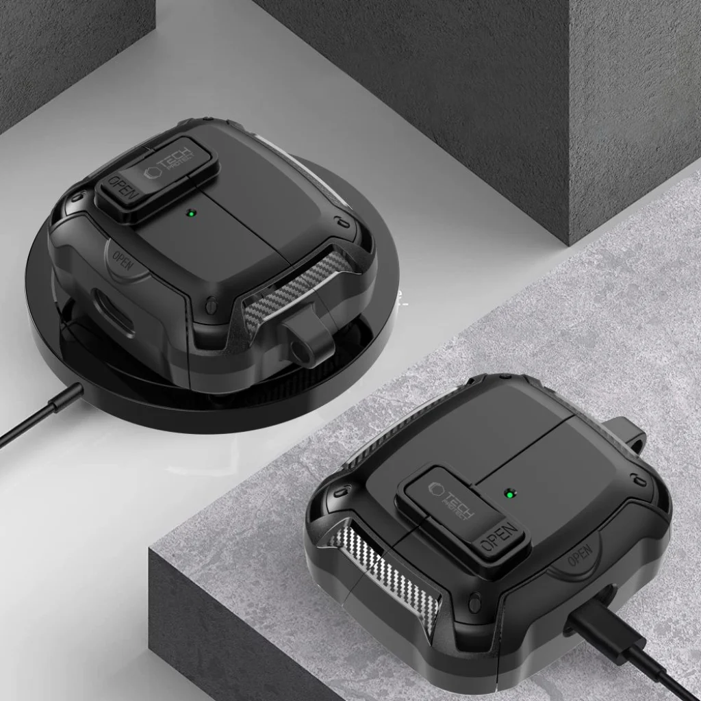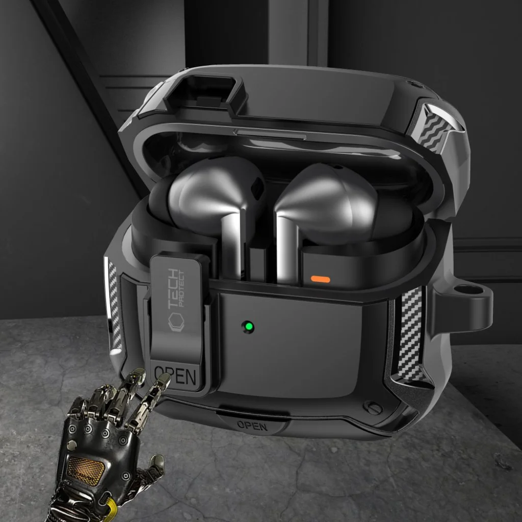 A Tech-Protect Carbonox védőtok ideális megoldás azok számára, akik teljes biztonságban és elegáns stílusban szeretnék tartani készülékeiket. Ez a masszív, páncélozott tok kiváló minőségű TPU és PC anyagokból készült, amelyek maximális védelmet nyújtanak ütődésekkel, karcolásokkal és ujjlenyomatokkal szemben. Az innovatív zár biztonságos gombbal teszi lehetővé a tok könnyű nyitását és zárását, biztosítva a fülhallgatók védelmét minden helyzetben. A Carbonox tok vezetékes és vezeték nélküli töltést is lehetővé tesz, így nem szükséges levenni a tokot a fülhallgatók töltéséhez. Rendkívül funkcionális kialakítása magában foglalja a látható előlapi LED diódát. További előnye egy tartós, levehető kulcstartó karabinerrel, amely lehetővé teszi a tok kényelmes rögzítését kulcsokhoz, táskákhoz vagy övekhez. Ezenkívül telefonállvány funkcióval is rendelkezik, amely lehetővé teszi az okostelefon stabil elhelyezését – ideális megoldás filmnézés, videohívások vagy multimédiás tartalmak használata közben. A Tech-Protect Carbonox megbízható védelem, kényelem és modern funkcionalitás egyben – ideális választás az aktív életmódot élők és a stílusos megjelenést kedvelők számára.