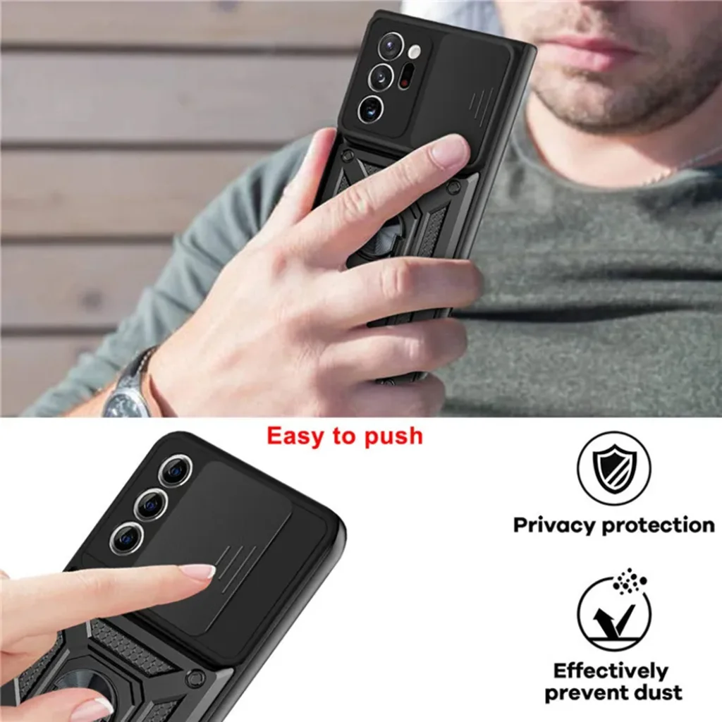 A Techsuit CamShield tok egyik kiemelkedő jellemzője a beépített, elhúzható kamera védőfedél. Ez a praktikus csúszka nem csak megóvja a Galaxy Note 20 Ultra értékes kameráit a karcolásoktól és a szennyeződésektől, de extra adatvédelmet is biztosít, amikor épp nem használja a kamerát. A fedél könnyedén eltolható ("Easy to push"), így pillanatok alatt hozzáférhet a lencsékhez, miközben hatékonyan megakadályozza a por bejutását is ("Effectively prevent dust").