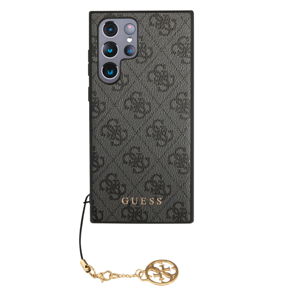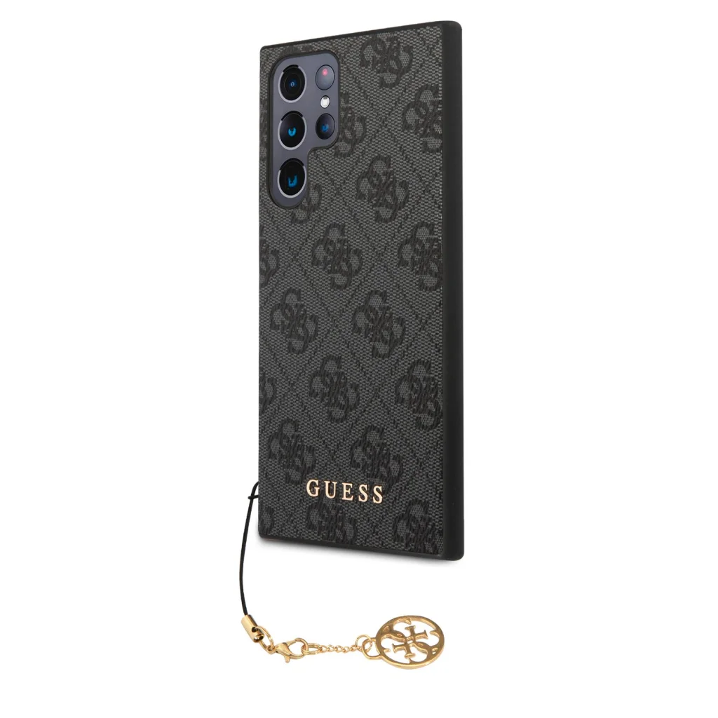 Guess 4G Charms prémium védőtok, Guess motívumú szövetborítású hátlap, rugalmas PU oldalak és tetszetős medál kombinációja.