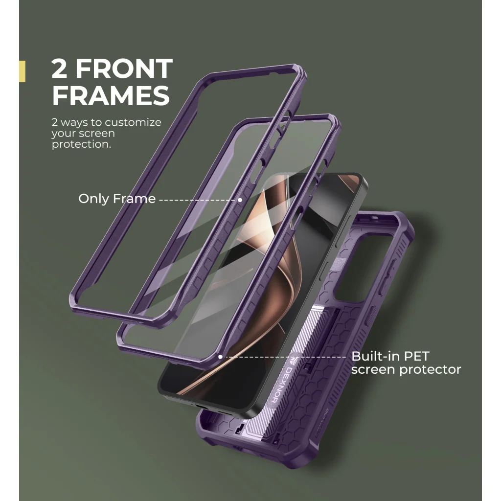 - Sokoldalú kijelzővédelem: A Dexnor tok két előlapi kerettel érkezik, így Ön választhatja ki a készülékéhez leginkább illő védelmet. Egyik keret beépített, karcálló PET képernyővédő fóliával rendelkezik, amely támogatja a Touch ID ujjlenyomat-felismerést. A másik keret képernyővédő nélküli, kompatibilis a saját edzett üvegfóliájával. A megemelt élek emellett extra védelmet biztosítanak a képernyőnek a karcolások és leejtések ellen.