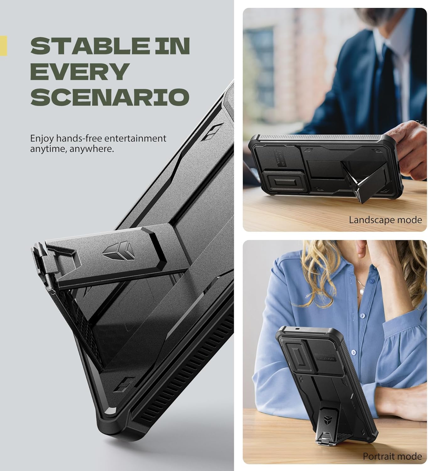 Élvezze a kéz nélküli szórakozást bárhol, bármikor! A beépített kitámasztó lehetővé teszi, hogy telefonját kényelmesen vízszintes (landscape) vagy függőleges (portrait) módban állítsa fel. Ideális videónézéshez, videóhívásokhoz, online tartalmak böngészéséhez vagy akár főzés közbeni receptek követéséhez.
