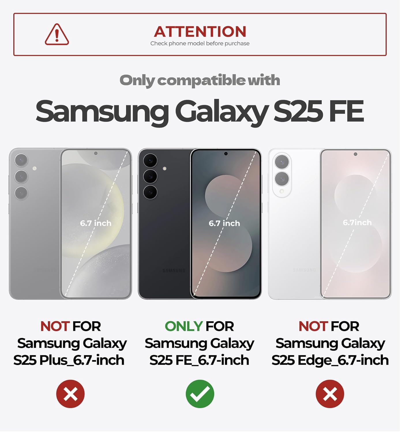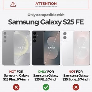 Figyelem! Ez a tok kizárólag a Samsung Galaxy S25 FE (6.7-inch) modellhez tervezve. Nem kompatibilis a Samsung Galaxy S25 Plus (6.7-inch) vagy Samsung Galaxy S25 Edge (6.7-inch) készülékekkel. Kérjük, vásárlás előtt ellenőrizze telefonja típusát!