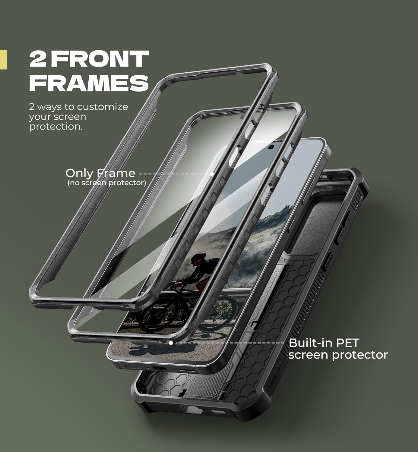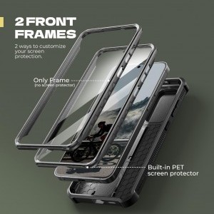 - Dupla elülső keret a testre szabott védelemért: Kétféleképpen szabhatja testre a kijelző védelmét. Válasszon az beépített PET kijelzővédővel ellátott keret és az anélküli keret közül (ha saját fóliát használna).