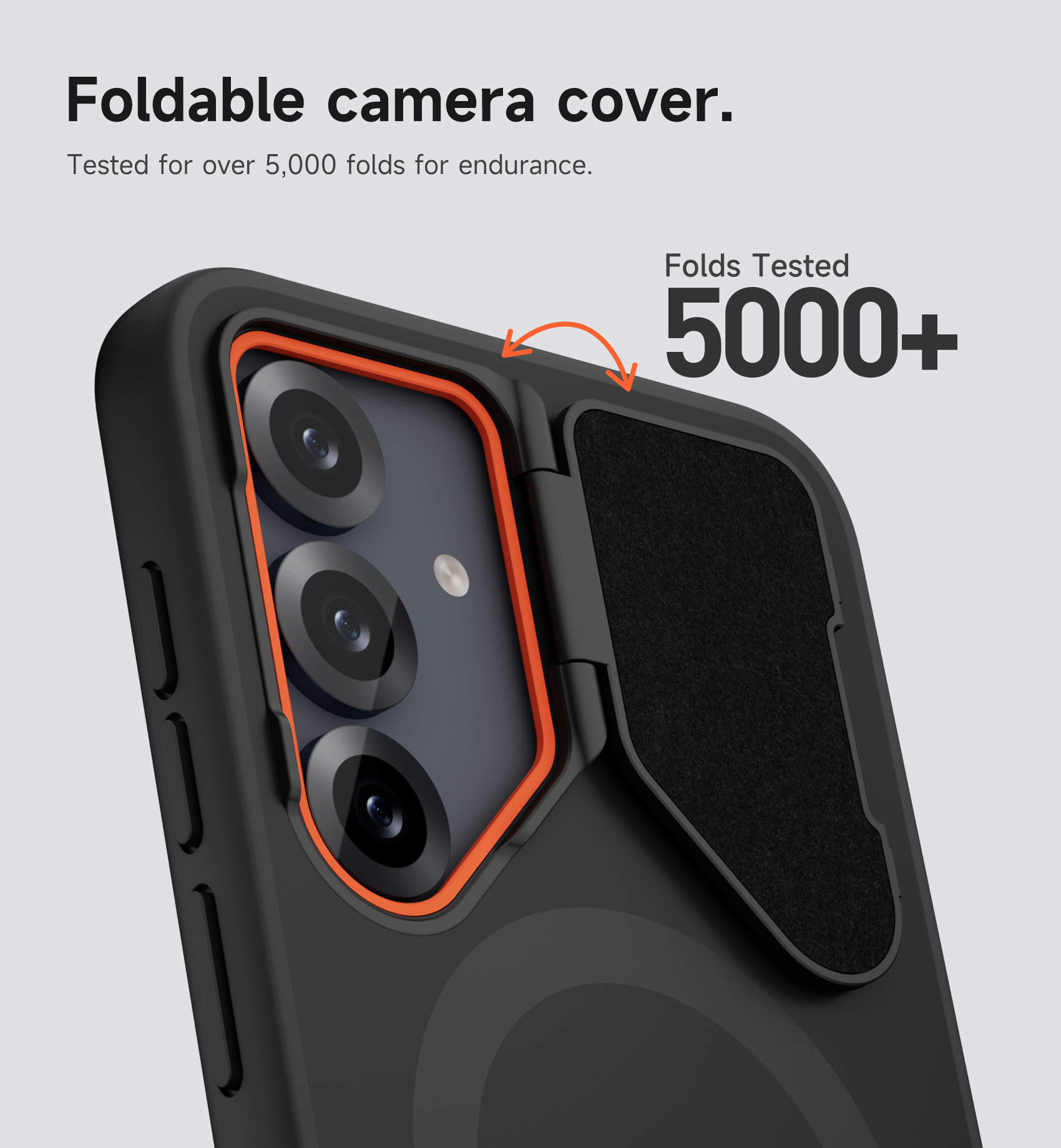 A beépített, összecsukható kamerafedél gondoskodik a telefon kamerájának extra védelméről a karcolások és ütések ellen. Tartósra tervezve, több mint 5000 hajtásra tesztelve, így hosszú távú védelmet nyújt.