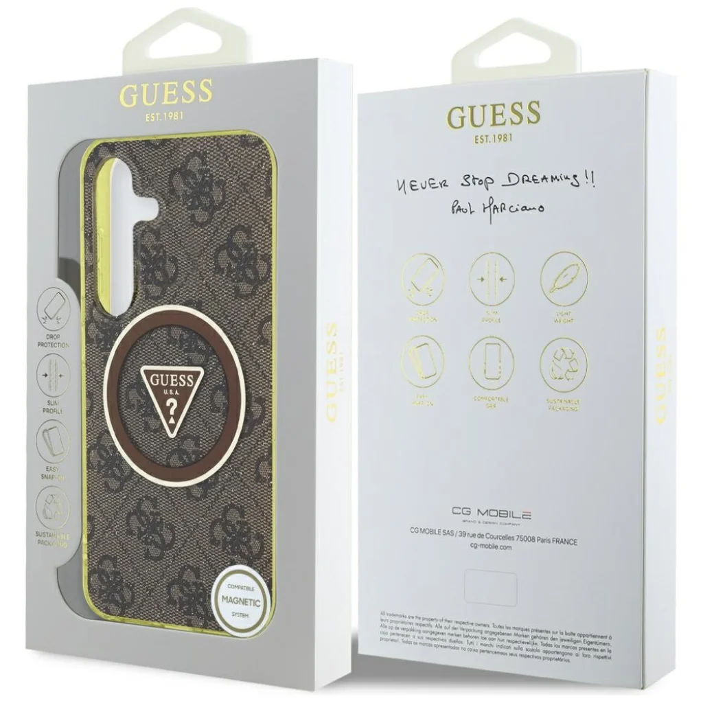 Az exkluzív védőtok az ismert Guess márkától a legmagasabb szinten ötvözi az eleganciát és a stílust. A tok magas minőségű polikarbonátból és poliuretánból készült. A csillogó felület jellegzetes 4G mintával és egy MagSafe gyűrűvel van díszítve. A tok közepén található a Guess logó, ami finoman emeli ki a tok presztízsét. Ez a tökéletes kombinációja a funkcionalitásnak és az elegáns dizájnnak, így a telefonod nemcsak jól védett, hanem divatos kiegészítő is lesz.