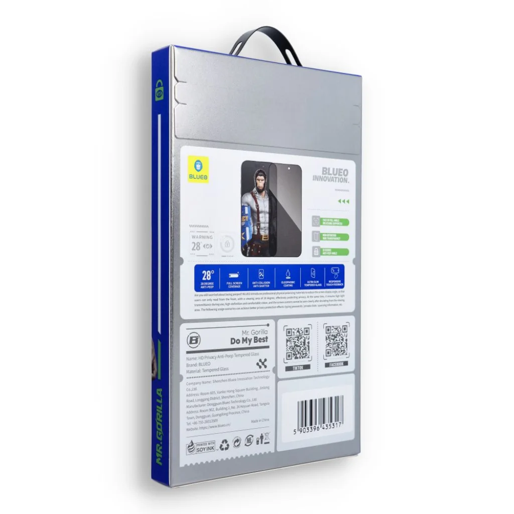 A Mr. Monkey Glass egy kiváló minőségű, edzett üveg teljes ragasztási felülettel. Az innovatív Anti-Blue bevonat korlátozza a káros kék sugárzást. A matt felület még jobb képminőséget biztosít, miközben megőrzi a magas érintési érzékenységet. Az ultra-alacsony 0,26 mm-es vastagságának köszönhetően a termék kiváló fényáteresztő képességgel rendelkezik. A felület olajtaszító feldolgozással (oleofób bevonattal) van ellátva, így az ujjlenyomatok és az olaj könnyen tisztíthatók. A matt kijelző felülete a játékosok körében is népszerű a kijelző magas érintési tulajdonságai miatt, amely kiváló képminőséget és megnövelt karcállóságot biztosít. Ultra-tartós, buborékmentes és tökéletes kivágásokkal rendelkezik a könnyű felhelyezés/eltávolítás érdekében. Az erős privát szűrős üveg egy egyedi üveg, szűrővel a képernyő sötétítéséhez. Csökkenti a megjelenített tartalom mennyiségét 30 fokos szög felett. Ezáltal lehetetlenné teszi a telefon tartalmának oldalról történő megtekintését, teljes láthatóságot hagyva meg csak a felhasználó számára. Funkciók: Ragasztó: A teljes ragasztási felületen Vastagság: 0,3 mm Biztonsági szint: Magas Védelmi szint: Magas Pormenetesség: Ellenállás a telefon széleinél lévő porral szemben Gyors rögzítés: Gyorsan száradó ragasztó