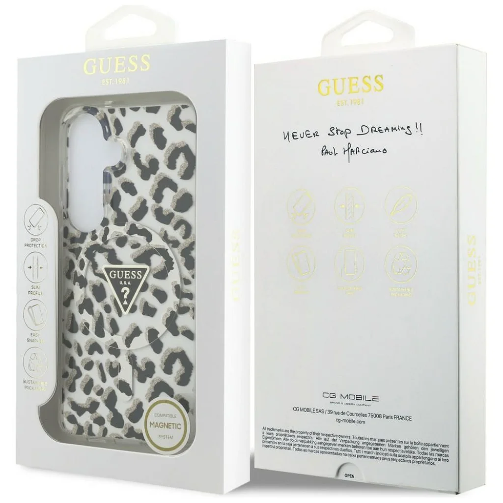 A Guess IML Leopárd Háromszög tok egy exkluzív vonal a védőtokok között, amely kivételes funkcionalitást stílusos és egyedi dizájnnal kombinál. Ezt a kollekciót azoknak tervezték, akik nemcsak telefonjuk biztonságát értékelik, hanem az elegáns megjelenést is. Tökéletes választás minden MagSafe technológiájú készülék tulajdonosának.