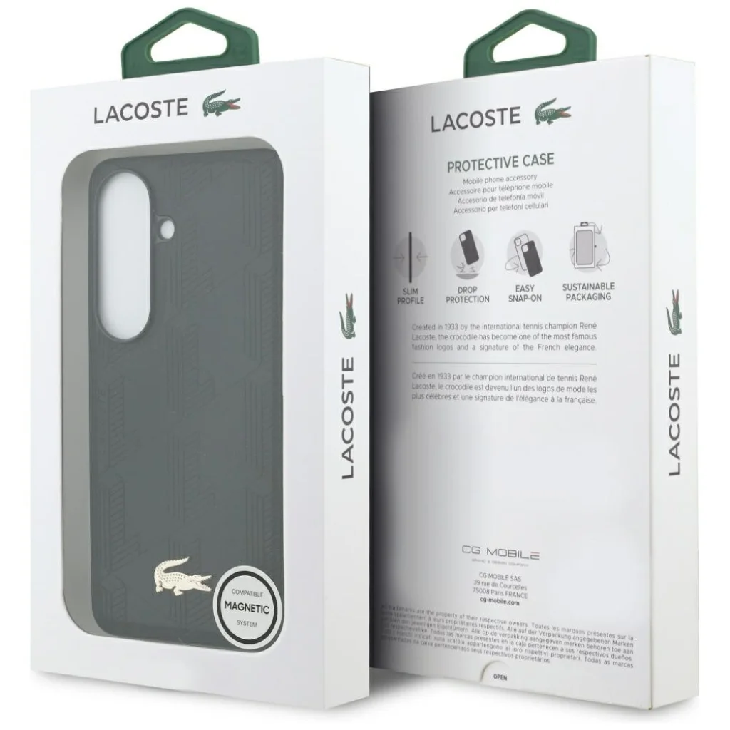 Stílusos megjelenés A tok kiváló minőségű öko-bőrrel van bevonva, és elegáns dombornyomott monogrammal rendelkezik. A kollekciót az ikonikus krokodil fém emblémája díszíti, amely tökéletesen tükrözi a Lacoste márka szellemét az elegancia és a sportos karakter ötvözésével. Ez az apró részlet az autentikusság és a prémium kivitelezés jele is, így a tok ideális választás azok számára, akik értékelik a stílust és a funkcionalitást.