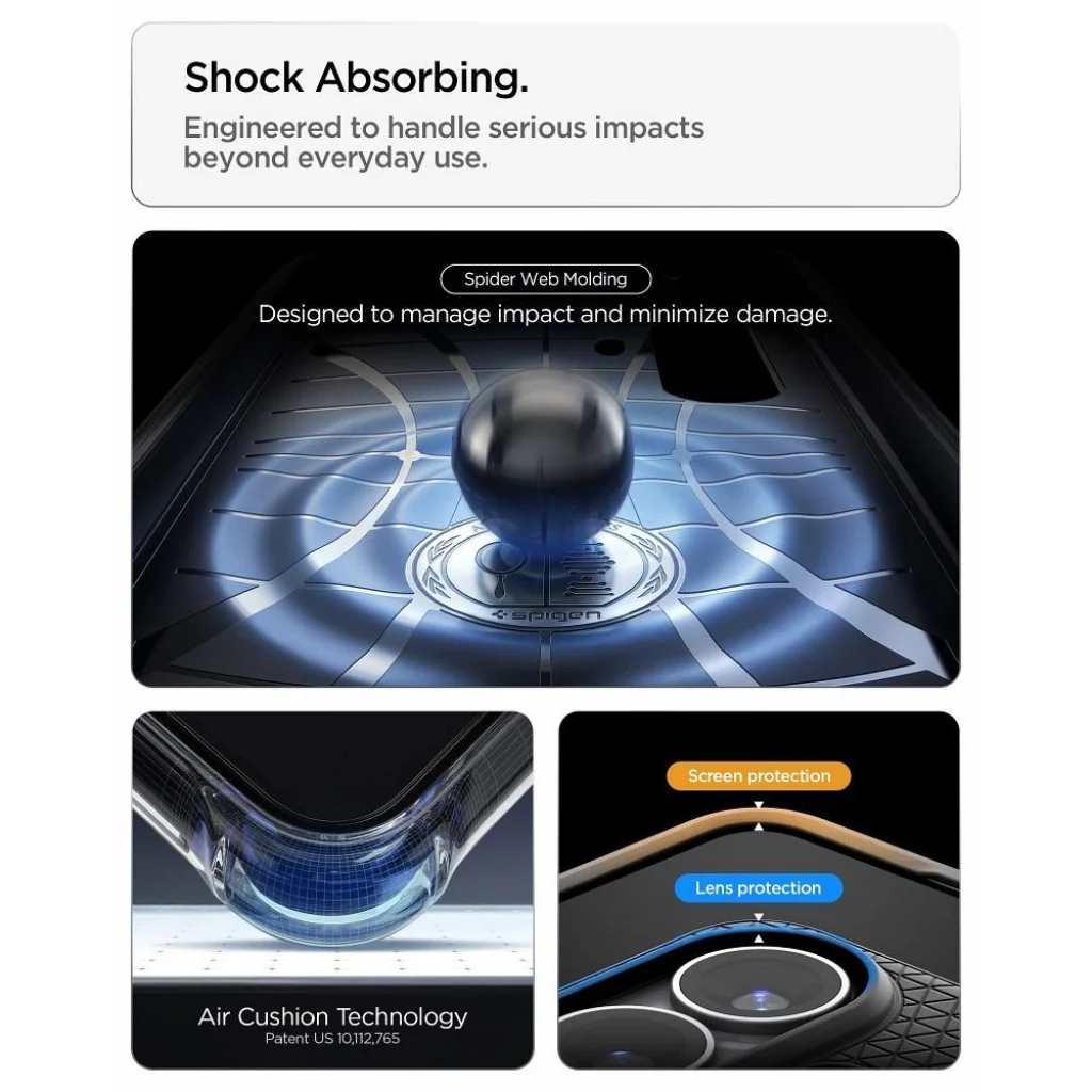 A Spigen Liquid Air tok teljes egészében tartós és rendkívül rugalmas TPU anyagból készült, amely hosszú távon garantálja telefonja biztonságát. Az "Effortless Fit" kialakításnak köszönhetően könnyedén és pontosan felpattintható a telefonra. A speciális Air Cushion technológia a tok sarkaiban kialakított légterekkel hatékonyan elnyeli az ütéseket esések során, minimalizálva a sérülések kockázatát a leginkább kitett pontokon. Ezt a fejlett ütéselnyelő képességet a belső oldalon található Spider Web Molding tovább erősíti, amely eloszlatja az energiát és csökkenti a károsodást. A megemelt élek gondoskodnak a kijelző és a kamerák extra védelméről: a lencsék precíz kivágásokkal teljesen fedettek, védve őket a mindennapi karcolásoktól, portól és a felületekkel való közvetlen érintkezéstől. A kijelző feletti élek pedig megakadályozzák a karcolásokat, amikor a telefont arccal lefelé helyezi le.
