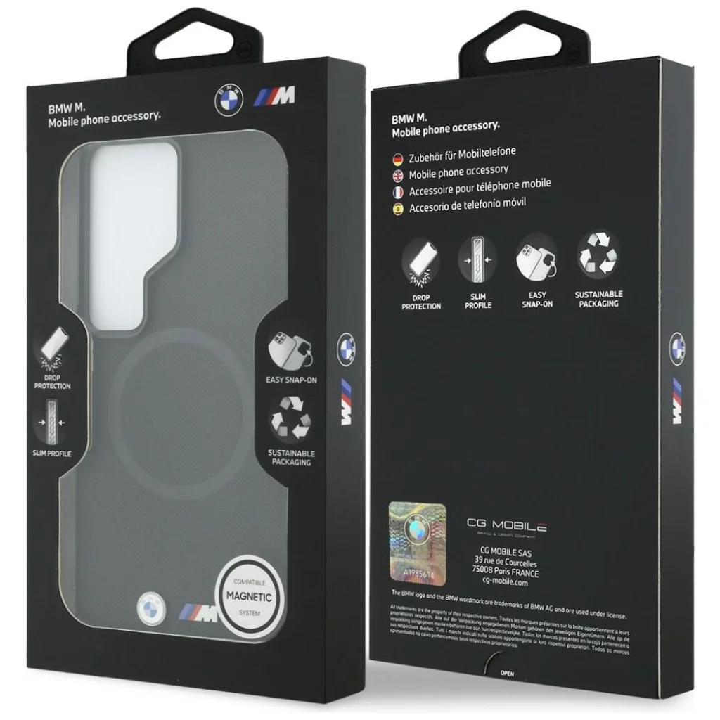 Exkluzív BMW tok az M Metal Logo MagSafe kollekcióból, kiváló minőségű védőburkolat, melyet a világ egyik legismertebb autómárkája jegyez. Tökéletes választás minden MagSafe technológiával rendelkező eszköz tulajdonosának. A BMW M Metal Logo tok a tartósságot és sportos jelleget ötvözi. Magas minőségű öko-bőrből készült, finom textúrájú felületével biztos fogást és elegáns megjelenést nyújt. A hátulját fém BMW M logó díszíti, kihangsúlyozva a kollekció hitelességét és presztízsét. Teljes mértékben kompatibilis a MagSafe rendszerrel, hatékony védelmet nyújt ejtések ellen, karcsú profiljával pedig tökéletesen illeszkedik a telefonra. A fekete kamerakeret és gombok modern és egységes karaktert adnak a teljes kialakításnak. A tok rugalmas szerkezetű, így az oldalak puhák, ami megkönnyíti a gyors felhelyezést és levételt. Karcsú profilja megőrzi a telefon elegáns megjelenését, miközben hatékony védelmet nyújt az ejtések ellen. A kissé megemelt élek a képernyő és a kamera körül további védelmet nyújtanak a karcolások ellen mindennapi használat során. A tok minden szükséges kivágással rendelkezik a portok számára és integrált gombfedőkkel, hogy a teljes funkcionalitást biztosítsa. Vezeték nélkül töltheted fel a telefonod! A tok mágneses gyűrűvel van felszerelve, amely kompatibilis a MagSafe vezeték nélküli töltővel, biztosítva a gyors és egyszerű töltést. A tokba épített mágnesek tökéletesen illeszkednek a felhasználó telefonjához, és erős tartást biztosítanak az iPhone számára a MagSafe töltőhöz. A tok BMW márka engedélyével készült. Műszaki adatok: Márka: BMW, Kollekció: M Metal Logo, Terméktípus: Védőtok, Anyag: Öko-bőr / PC / TPU, Szín: Fekete, Kompatibilitás: Samsung Galaxy S26 Ultra.