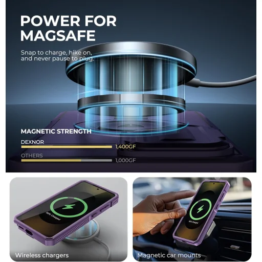 A Dexnor tok kiemelkedő, akár 1400g-os mágneses tartóerejével zökkenőmentesen csatlakozik minden MagSafe-kompatibilis tartozékhoz. Akár vezeték nélküli töltőt, akár mágneses autós tartót használsz, telefonod biztonságosan a helyén marad, bármilyen helyzetben is legyél. Élvezd a kényelmes töltést és a stabil rögzítést – pattintsd fel, indulj túrázni, és soha ne állítsd le a töltést egy csatlakozó miatt! Más tokokkal összehasonlítva, amelyek jellemzően 1000g körüli erőt biztosítanak, a Dexnor tok páratlan stabilitást és megbízhatóságot nyújt.