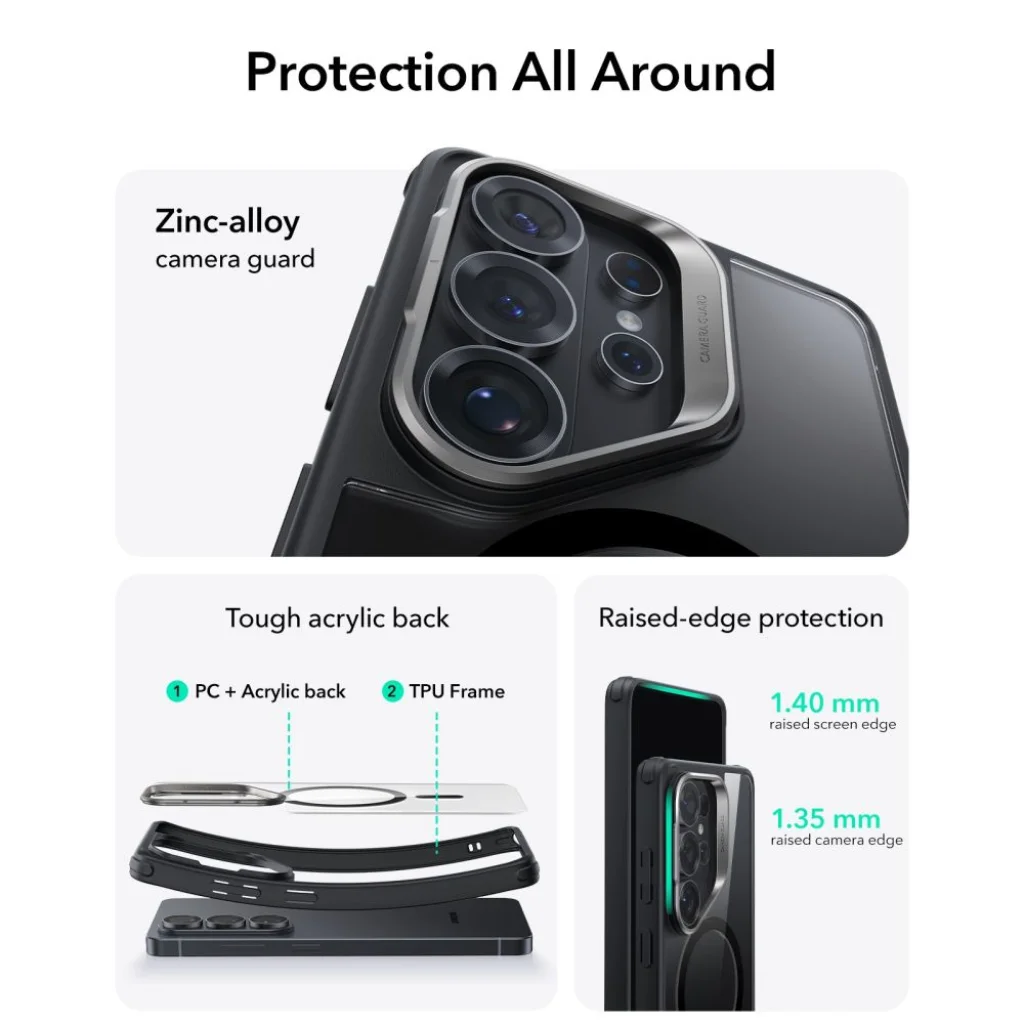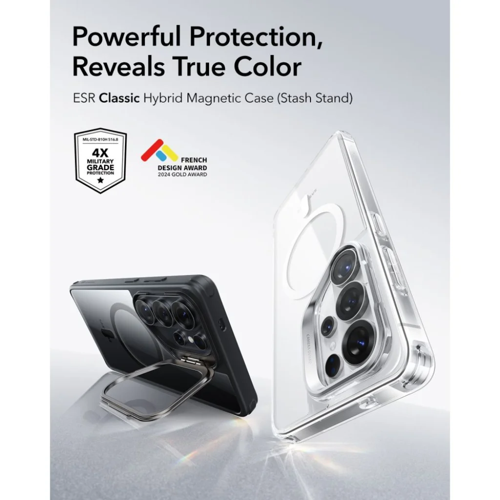 Az átlátszó/fekete design kiemeli a Samsung Galaxy S26 Ultra eredeti szépségét, lehetővé téve, hogy telefonja "igazi színe" ragyogjon. A tok karcsú kialakítása (Slim Build, Original Feel) biztosítja, hogy a készülék kényelmesen illeszkedjen a kézbe és a zsebbe. A precíz kivágások és gombvédők akadálytalan hozzáférést biztosítanak a telefon minden funkciójához, miközben védik a portól és szennyeződésektől. Az ESR Classic Hybrid Kickstand MagSafe tok a 2024-es French Design Award arany díjának büszke tulajdonosa, ami elismerése a kiemelkedő tervezésnek és innovációnak.