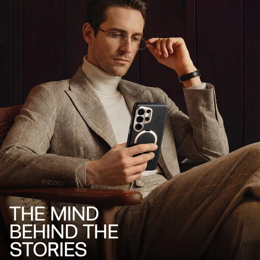 A tokot úgy tervezték, hogy megőrizze a Samsung Galaxy S26 Ultra karcsú vonalait és eredeti megjelenését. A precízen illeszkedő kialakítás kényelmes fogást biztosít, anélkül, hogy felesleges tömeget adna a készülékhez. Az Iovry Black szín és az elegáns aranyozott részletek – mint a kameragyűrű, a gombok és az állvány – luxus és professzionális megjelenést kölcsönöznek, kiemelve a telefon prémium karakterét.