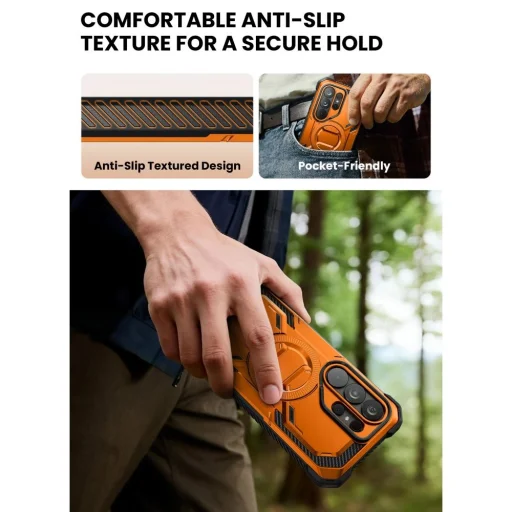 - Ergonomikus kialakítás: A kényelmes, csúszásgátló textúra biztonságos fogást biztosít, miközben a tok mégis zsebbarát marad, így könnyedén tárolható.