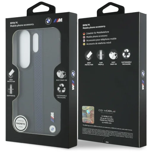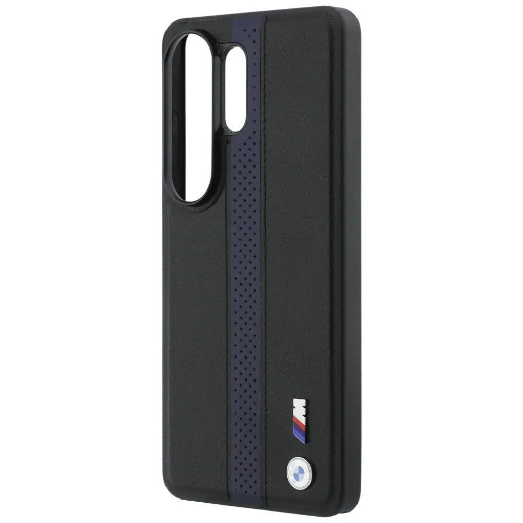 Merüljön el az elegancia és a sportos dinamika világában ezzel az exkluzív BMW M védőtokkal. A kiváló minőségű öko bőrből készült tokot egy függőlegesen futó, kék színű perforált csík díszíti, amely egyedi textúrát és vizuális mélységet kölcsönöz a fekete alapnak. A hátlapon elegánsan elhelyezett fém BMW és BMW M logók tanúskodnak a kollekció hitelességéről és a BMW gazdag örökségéről, büszkén hirdetve: "The Most Powerful Letter in the World" – utalva az M logóra.