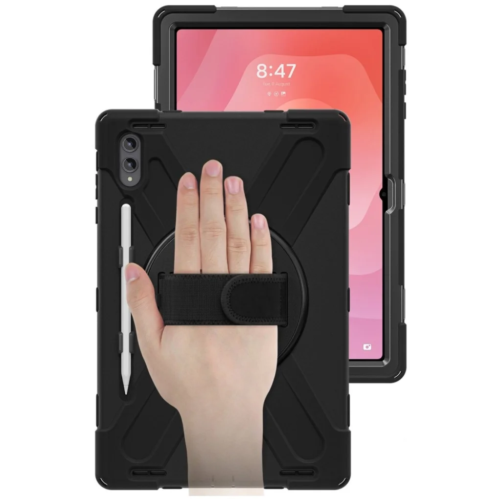 A szilárd, strapabíró konstrukció egyesíti a rugalmas ütéscsillapító réteget egy merev kerettel, amely megóvja a táblagépet az esésektől, ütésektől és karcoktól. A 360°-os állvány funkció lehetővé teszi a képernyő tájkép vagy álló módú megtekintését. A megerősített sarkok hatékonyan elnyelik az ütési energiát, míg a kijelző és a kamera körüli megemelt élek megvédik a készülék legérzékenyebb részeit a közvetlen felületi érintkezéstől.