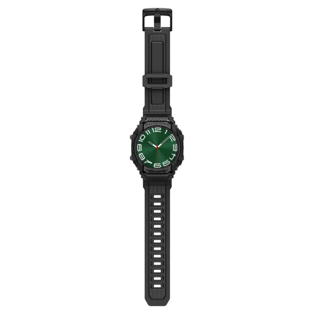 Kényelmes pánt sportos csavarral, Spigen Rugged Armor "Pro". Rugalmas TPU anyagból készült, karbon szál hatású díszítésekkel. Beépített házzal rendelkezik, emelt élekkel, melyek védik az óratokot a karcolásoktól és ütésektől. A pánt teljesen funkcionális és az egyéni igényekhez igazítható.