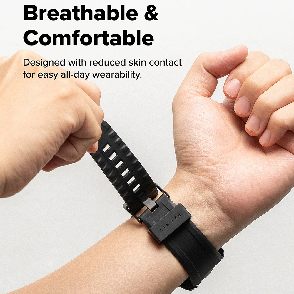 • Légáteresztő és kényelmes: A csökkentett bőrkontaktusra tervezett szíj a speciális kialakításnak köszönhetően légáteresztő, így egész napos viselet során is maximális kényelmet nyújt, megakadályozva az izzadást.