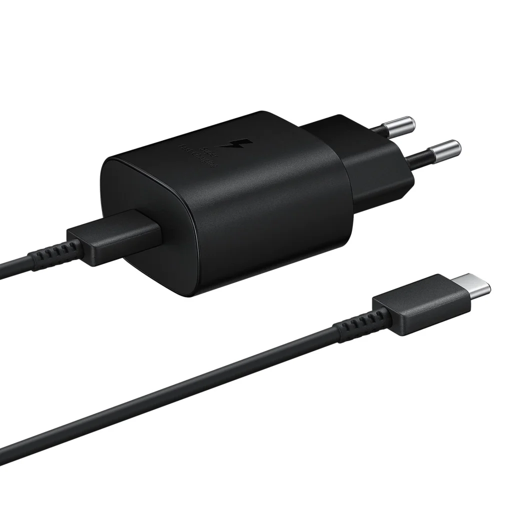 Samsung hálózati töltő USB-C kimenettel, 25 W maximális teljesítménnyel és USB-C adatkábellel.