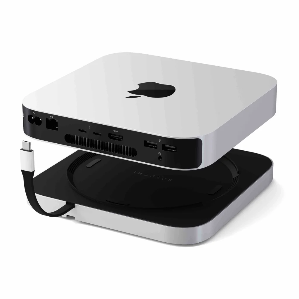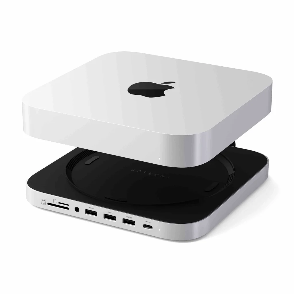 Satechi Állvány és Hub Mac Mini / Studio-hoz (1x USB-C 3.2, 1x USB-A 3.2, 2x USB-A 3.0, 3.5 mm audio, 1x Micro/SD, 1x NVMe/M.2 SATA SSD ház meghajtó nélkül) - Ezüst