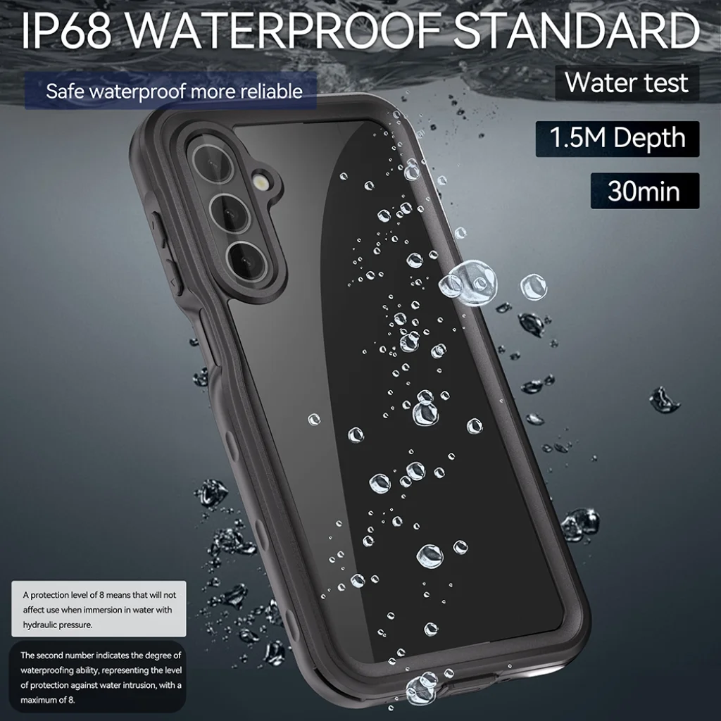 - IP68 vízállósági szabvány: A tok a legmagasabb szintű, IP68-as vízállósági minősítéssel rendelkezik, ami garantálja a telefon teljes védelmét 1,5 méteres mélységig, 30 percen keresztül. Ez a védettségi szint azt jelenti, hogy a készülék gond nélkül használható vízbe merítve, hidraulikus nyomás esetén is.