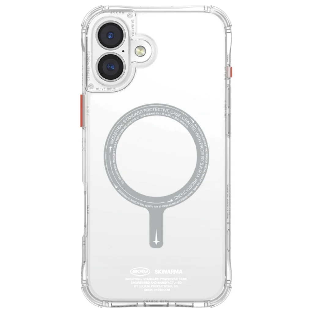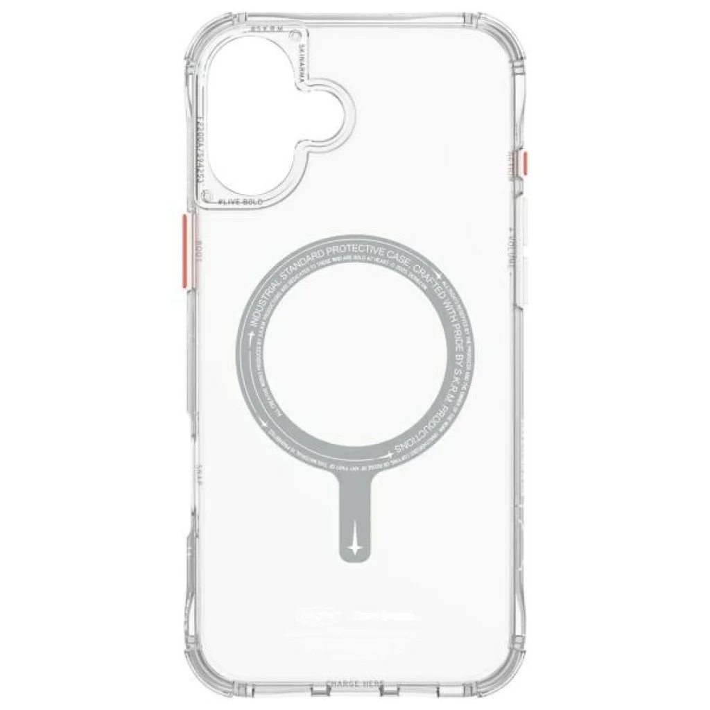Ez az átlátszó tok teljes mértékben kompatibilis a MagSafe mágneses töltéssel, biztosítva a gyors és biztonságos vezeték nélküli energiaellátást. A tok hátoldalán elegánsan megjelenő MagSafe gyűrű (amelyen a "INDUSTRIAL STANDARD PROTECTIVE CASE CRAFTED WITH PRIDE BY SKRM PRODUCTIONS" felirat olvasható) nemcsak a funkcionalitást hangsúlyozza, hanem esztétikai elemként is szolgál. A „MAG-CHARGE SECURE MAGNETIC ALIGNMENT” garantálja a megbízható mágneses illeszkedést, ami gondtalan töltési élményt biztosít.