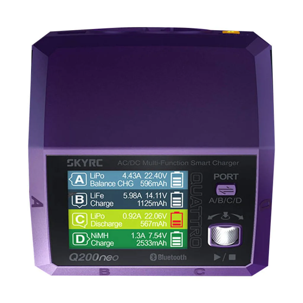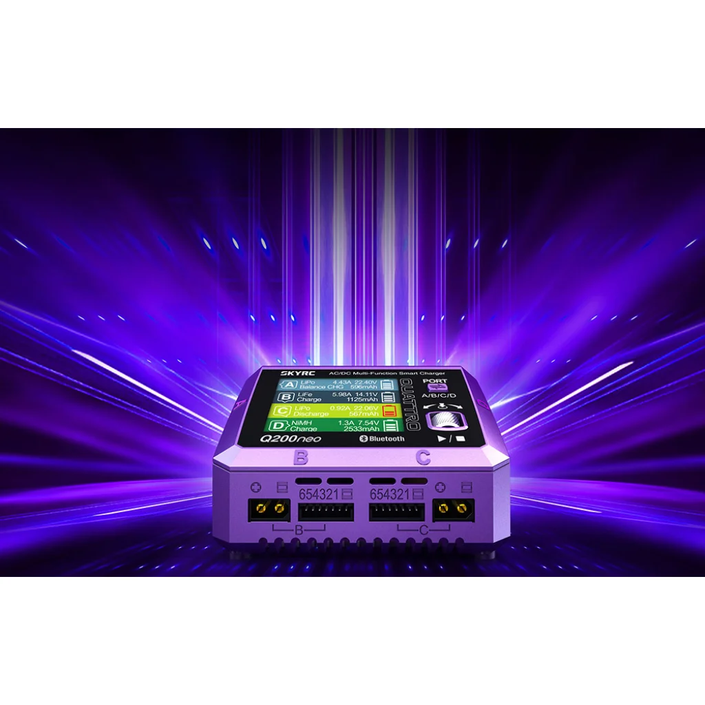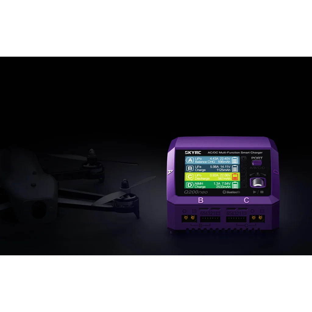 Az innovatív SkyRC Q200neo töltő tökéletes választás minden RC-rajongó számára. Lehetővé teszi 4 különböző akkumulátor egyidejű töltését, és egyenárammal (DC) és váltakozó árammal (AC) egyaránt működtethető. Akár 400 W-os teljesítményével és beépített, nagy pontosságú kiegyenlítőjével tűnik ki, amely ±0,02 V-on belül optimalizálja a feszültségkiegyenlítést. Nagy teljesítményű képességei ellenére a termék meglepően kompakt és hordozható.