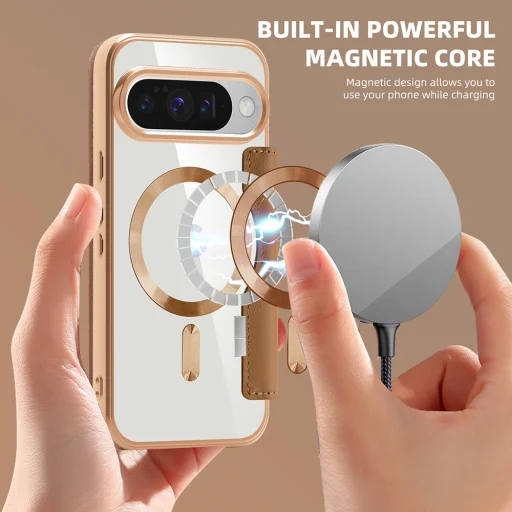 A SmartMag tok egyedülálló, kétkomponensű kialakítású: a telefonja egy átlátszó, megerősített hátlappal és galvanizált kerettel (arany/rozéarany árnyalatban) ellátott mágneses tokban ül, amely önmagában is teljes körű védelmet nyújt. Ez a belső tok a beépített, erős mágneses magnak köszönhetően könnyedén rögzül a szintetikus bőrből készült, pénztárca-stílusú külső borításhoz. A mágneses kialakítás lehetővé teszi, hogy telefonját kényelmesen használja akár töltés közben is, különösen a MagSafe-kompatibilis vezeték nélküli töltőkkel.