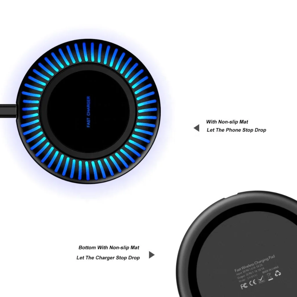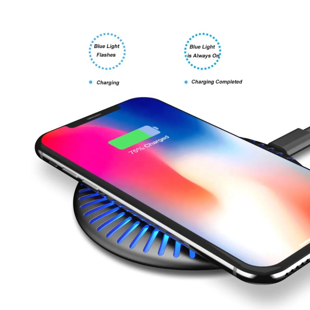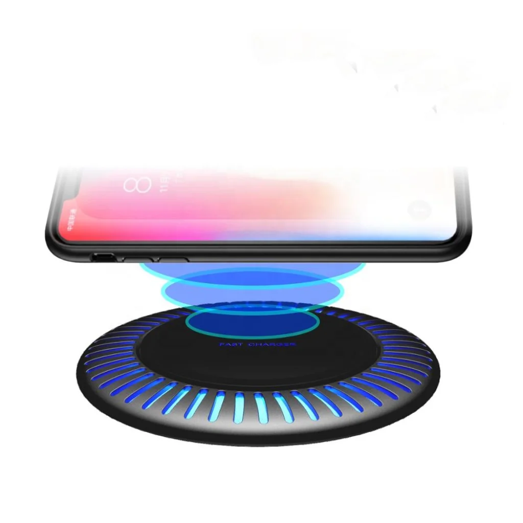 Vezeték nélküli gyorstöltő (10W). Csúszásmentes talppal. Anyaga ABS+PC. Színe fekete. Segítéségével 2db QI vezeték nélküli szabvánnyal kompatibilis eszközt tölthetünk egyidejűleg. A csomagban megtalálható a kábel, amit fali aljzatba dughatunk, aminek minimum 2A teljesítmény ajánlott. Töltés közben kéken villog, ha feltöltött folyamatosan világít.