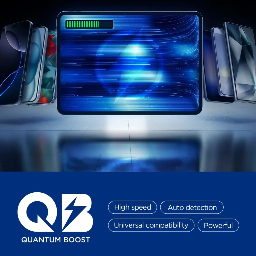 A Quantum Boost technológia (QB) intelligensen optimalizálja a töltési paramétereket a csatlakoztatott eszközhöz igazítva, ezáltal biztosítva az optimális sebességet és a biztonságos táplálást. Ez a fejlett funkció garantálja a: