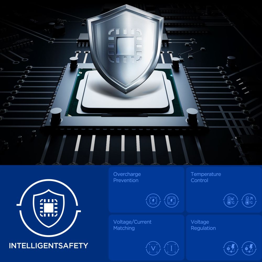 A Spigen Essential EE352EU töltő az Intelligent Safety funkcióknak köszönhetően maximális védelmet nyújt eszközeinek. A beépített biztonsági rendszerek megóvják készülékeit a túltöltéstől, túlfeszültségtől és az instabil áramtól, így garantálva a biztonságos és stabil töltést minden körülmények között. Ezek közé tartozik: