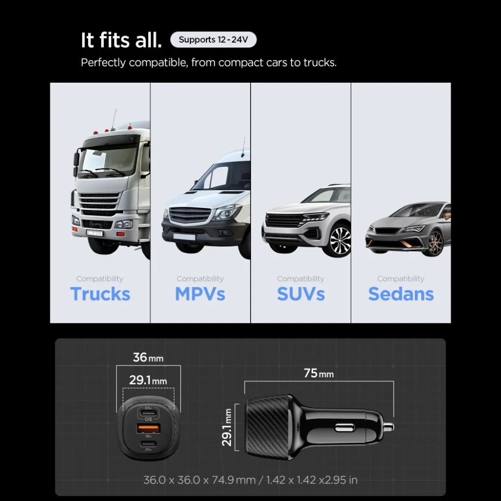 Két USB-C és egy USB-A porttal felszerelve széles körű kompatibilitást kínál okostelefonok, táblagépek, laptopok és egyéb mobil eszközök számára, legyen szó személyautóról, furgonról, SUV-ról vagy kamionról, köszönhetően az univerzális 12-24V-os feszültségtámogatásnak.
