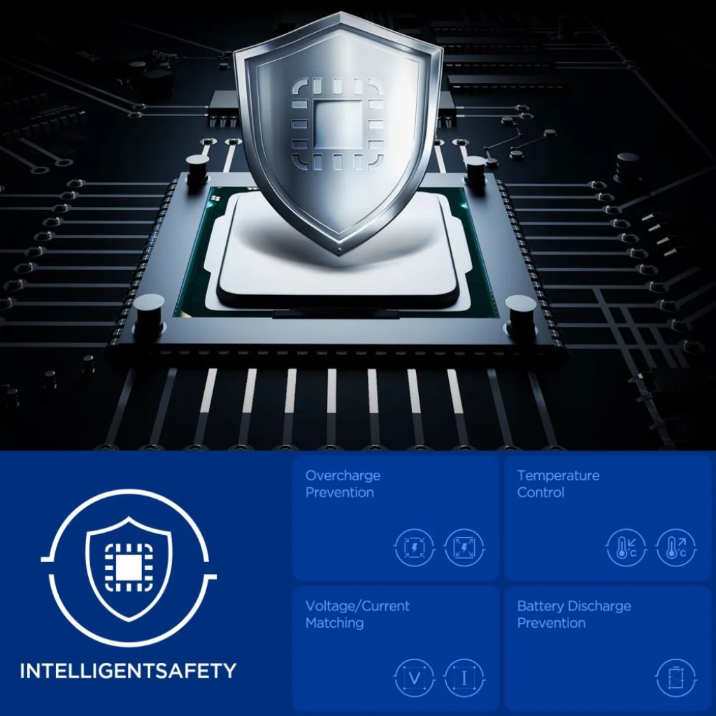 - Intelligens 15 fokozatú biztonsági rendszer: Átfogó védelmet nyújt a túltöltés, túlmelegedés, túlfeszültség, túláram és akkumulátor kisülés ellen (Intelligent Safety).