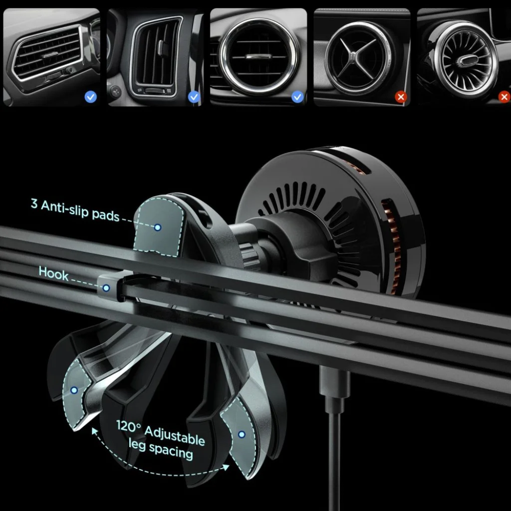 Az autós tartó 360 fokos forgathatósága lehetővé teszi, hogy telefonját kényelmesen, vízszintesen vagy függőlegesen állítsa be, optimalizálva a látószöget. A légkondicionáló rácsra szerelhető kialakításnak köszönhetően a legtöbb autóval kompatibilis, kivéve bizonyos Mercedes-Benz modelleket a kiemelkedő szellőzők miatt. A stabil rögzítéshez 3 csúszásmentes párna és egy kampós mechanizmus tartozik, az állítható tartólábak pedig 120 fokban nyithatók, biztosítva a tökéletes illeszkedést.