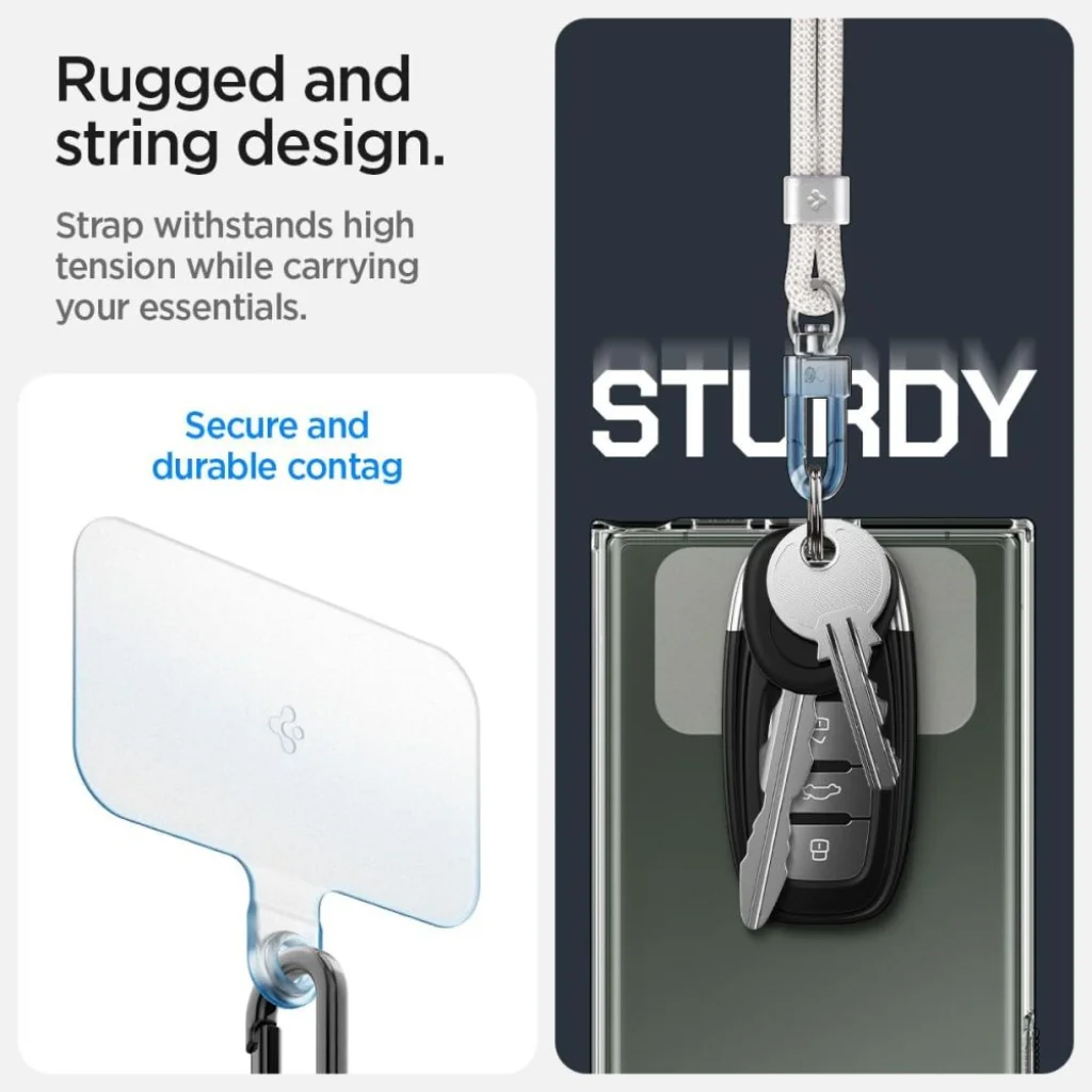 Tartós és sokoldalú Spigen pántkészlet, amelyet a modern használhatóság jegyében terveztek. A Crossbody pánt (maximális hossza 790mm) és a csuklópánt (maximális hossza 220mm) lehetővé teszik a telefon vagy más eszközök vállon vagy csuklón való hordását különböző módokon. A masszív karabiner és a mellékelt speciális műanyag ConTag alátét további lehetőségeket biztosítanak. A pántok állíthatóak és fonott dakronból készültek, ami biztosítja tartósságukat és ellenálló képességüket.