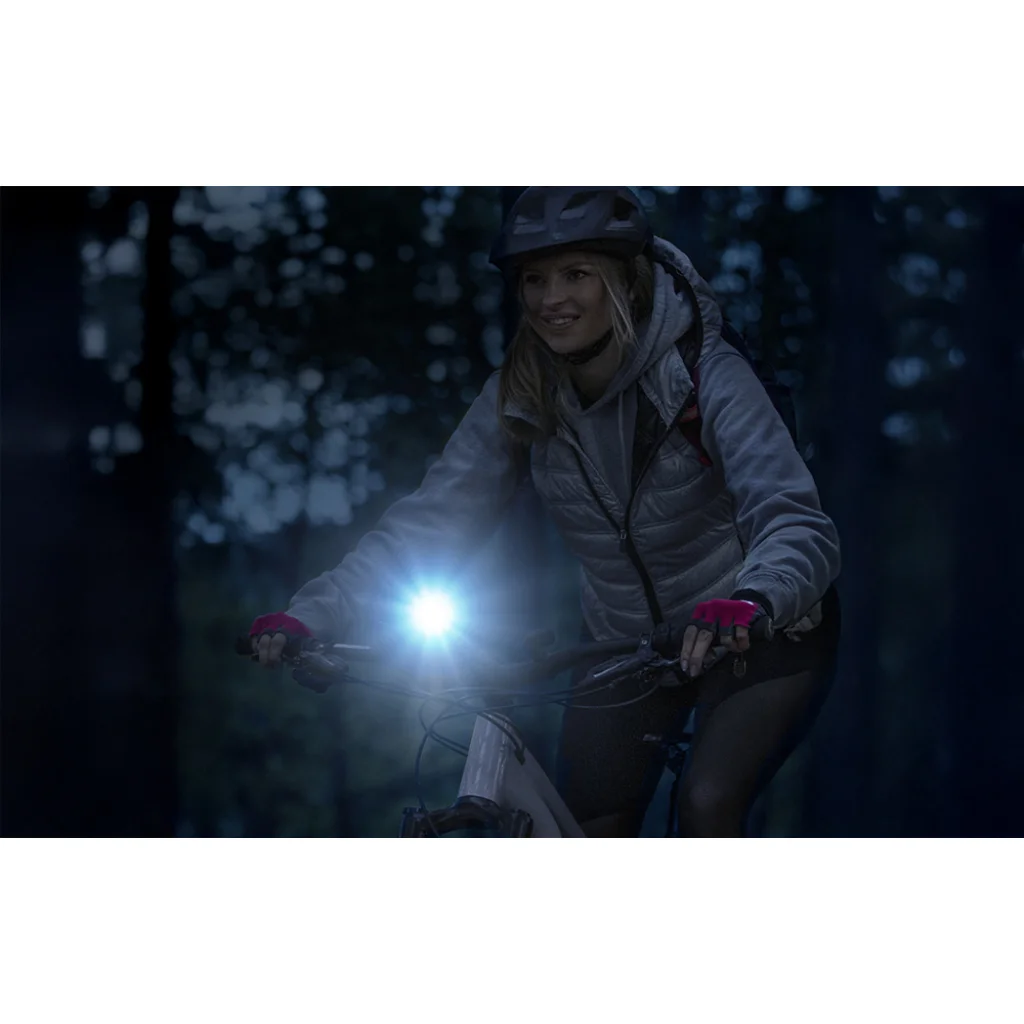 A zseblámpa beépített 18650-es akkumulátorral rendelkezik, amelynek kapacitása 1400 mAh, és amely kényelmesen tölthető USB Type-C porton keresztül. Kompakt méretei (102 x 33 x 32 mm) és alacsony súlya (csupán 80 g) miatt a készülék nem nehezíti meg a kerékpárt vagy a felszerelést. Az IP54 besorolás védi a zseblámpát a portól és a fröccsenő víztől, így változó időjárási körülmények között is használható.