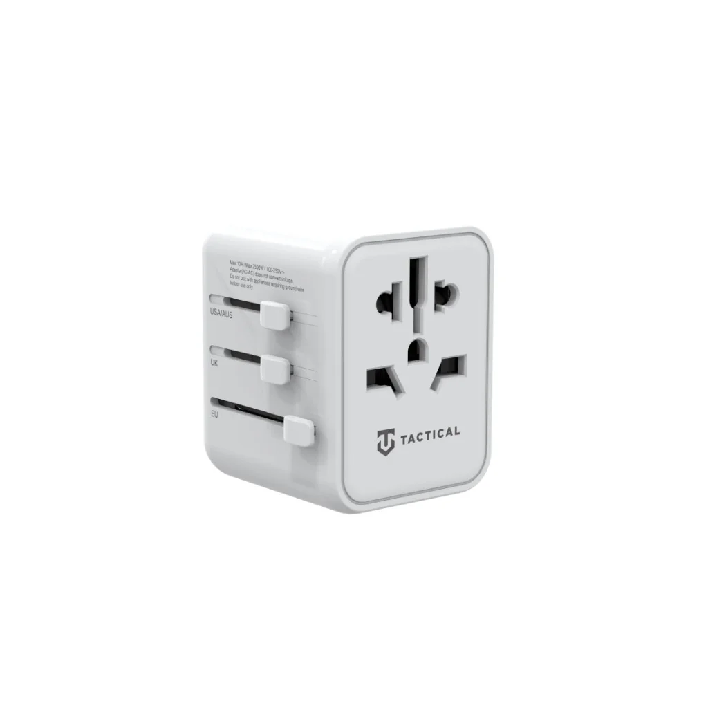 A behúzható villákkal a Tactical PTP Adapter négy cserélhető aljzatra válthat az amerikai, európai, brit és ausztrál dugaljszabványoknak megfelelően.