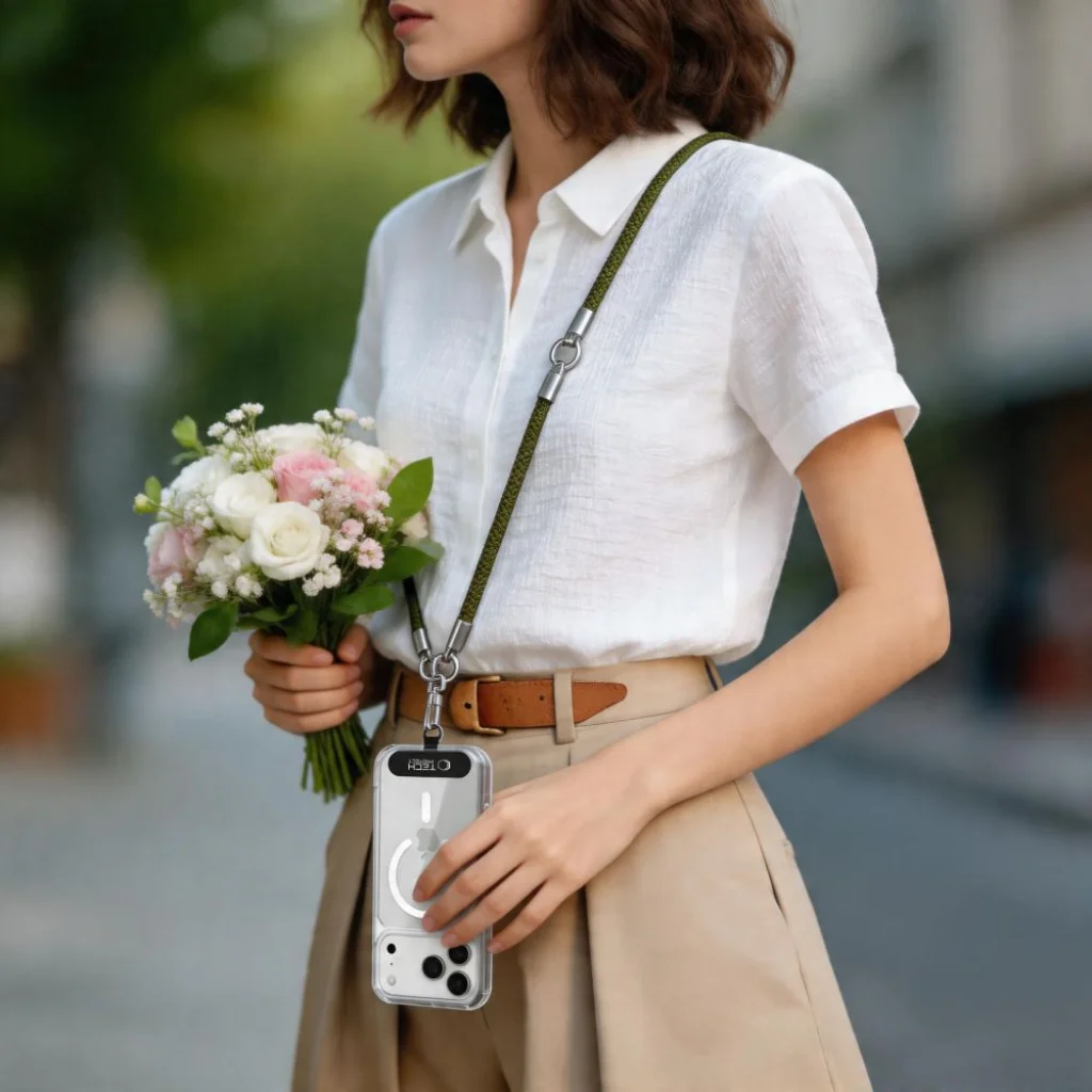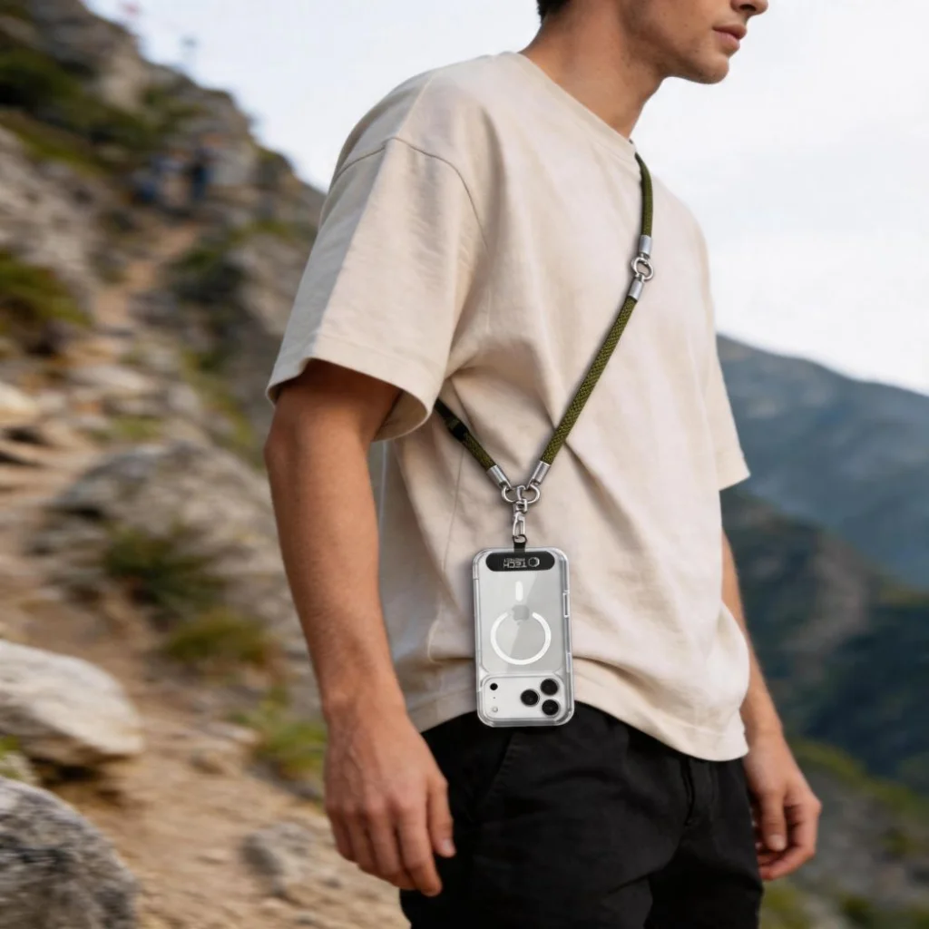 A mellékelt adaptert a tok és a telefon közé kell becsúsztatni, így rögzítési pontot biztosít mindkét pánt karabineréhez. Ennek köszönhetően a szett bármilyen okostelefonnal és bármilyen tokkal használható, ragasztás és a készülék módosítása nélkül. A helyzettől függően egyszerűen cserélhető a pánt – városi használathoz a hosszú crossbody pánt, aktívabb helyzetekhez a rövid csuklópánt ideális.