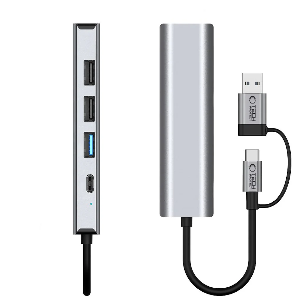 A Tech-Protect HB03 HUB Adapter 5 az 1-ben egy kompakt, többfunkciós eszköz, amely minden USB-C és USB-A portot támogató számítógép számára megfelelő. A szilárd alumínium és ABS anyagból készült kialakításnak köszönhetően az adapter könnyű, ugyanakkor tartós és ellenálló a sérülésekkel szemben. Az eszköz hat porttal rendelkezik, amelyek különböző funkciókat kínálnak.