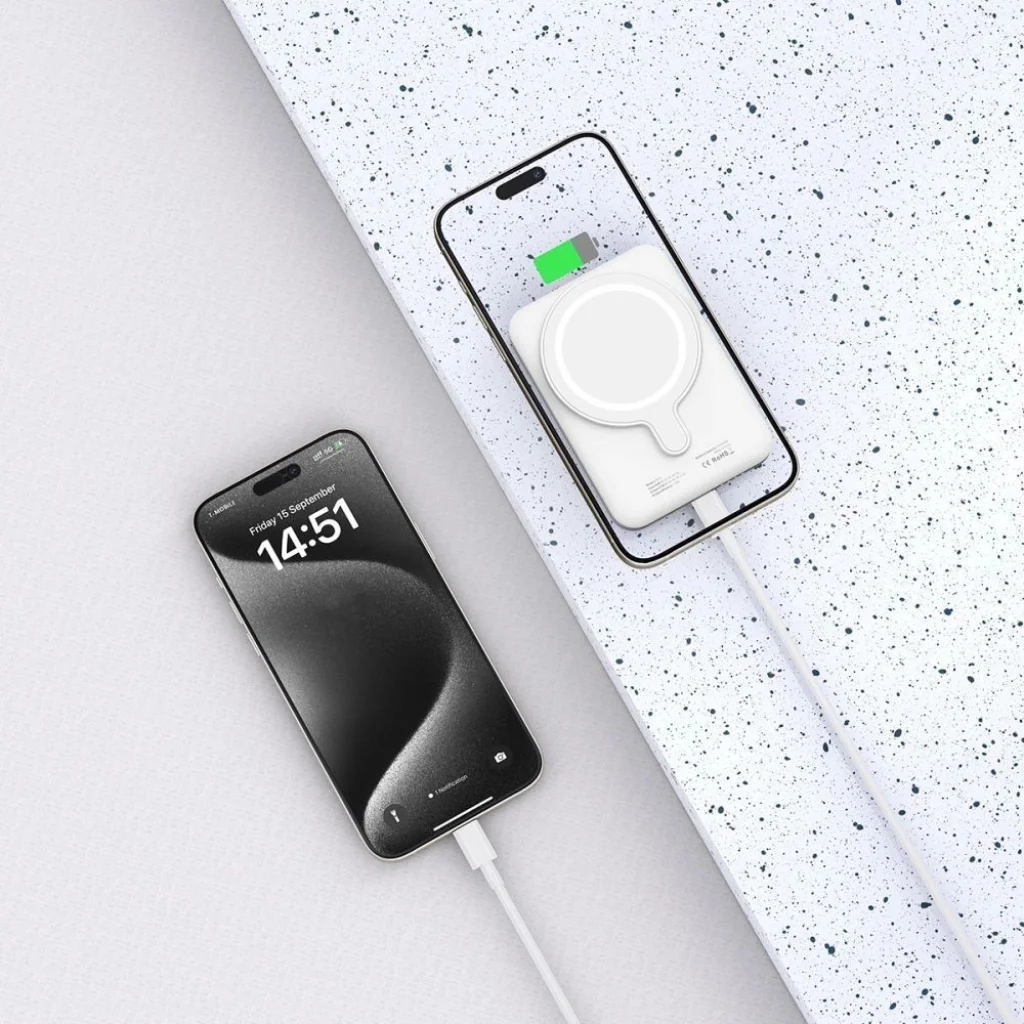 A stílusos és elegáns powerbank nemcsak vezeték nélküli töltésre képes, hanem a USB-C porttal ellátott, így gyorsan újratölthető más eszközök, például okostelefon vagy tablet, energiája is. Kiváló minőségű ABS és polikarbonát anyagokból készült, mely esztétikus és minimalista megjelenést biztosít. Tartalmazza a szokásos szenzorokat is, mint például túlfeszültség-, túlterhelés-, és rövidzárlat elleni védelemmel. A MagSafe mágneses funkció csak közvetlenül a telefonnal vagy egy beépített mágneses szemmel ellátott tokkal használható MagSafe technológiával.