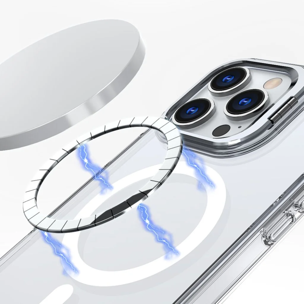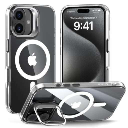 Klasszikus, átlátszó kialakítása kiemeli a készülék eredeti dizájnját, elegáns megjelenést kölcsönözve neki. A lencsék körüli emelt védelmen túl, a tok egy fém, nyitható kerettel is rendelkezik, amely egyszerűen átalakítható praktikus állvánnyá. Ez kényelmes filmnézést, fotók böngészését vagy videohívások lebonyolítását teszi lehetővé.