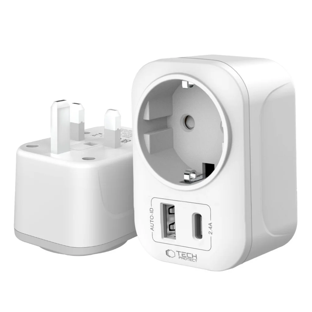 A Tech-Protect TA100 egy kompakt és megbízható átalakító, amely lehetővé teszi az európai típusú csatlakozóval rendelkező eszközök csatlakoztatását brit típusú aljzatokhoz. Tartós anyagokból készült, és akár 2500 W teljesítményű stabil és biztonságos áramellátást biztosít, 100–250 V bemeneti feszültséget és 50–60 Hz-es frekvenciát támogatva. Az adapter két töltőporttal rendelkezik – USB-A és USB-C – 5 V / 2.4 A összesített kimenettel, lehetővé téve okostelefonok, táblagépek és más mobil eszközök gyors töltését. Kompakt méreteivel és könnyű szerkezetével tökéletesen alkalmas utazásra, a beépített túlterhelés és rövidzárlat elleni védelem pedig teljes biztonságot garantál a használat során. A Tech-Protect TA100 praktikus és elegáns megoldás az Európából az Egyesült Királyságba utazók számára, kényelmesen biztosítva az európai eszközök használatát brit aljzatokban.