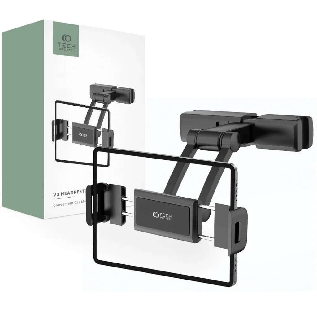 Univerzális Tech-Protect V2 autós tartó, amely az ülés fejtámlájára szerelhető, és olyan eszközökhöz lett kialakítva, mint a telefon vagy tablet. Kényelmes és egyszerű használatával tökéletes hosszú utazásokhoz, szórakozást nyújtva az utasok számára is. Tartós és könnyű anyagokból készült, mint például alumínium ötvözet, polikarbonát és szilikon. Az állítható tartókar stabilizálja az eszközt és megakadályozza annak mozgását még nehéz körülmények között is, a behajtható karok lehetővé teszik a termék méreteinek minimalizálását, ha nincs használatban. A 360°-ban forgatható fej lehetővé teszi az eszköz függőleges és vízszintes elhelyezését, így alkalmazkodik az egyéni igényekhez, akár a legfiatalabb felhasználó számára is. A termék széleskörű kompatibilitással rendelkezik - 130 és 165 mm közötti fejtámlákhoz készült, míg a pofák képesek megfogni 112 és 200 mm közötti szélességű eszközöket.