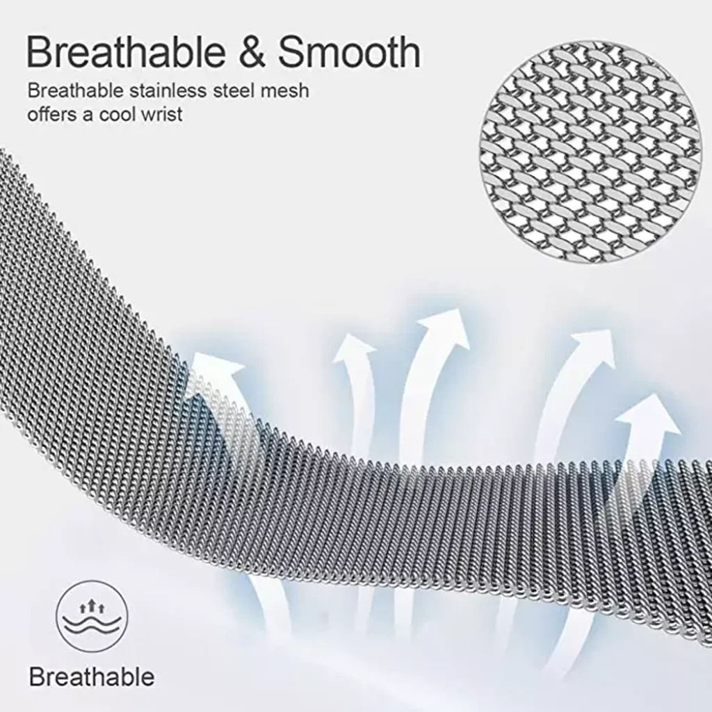 - Precíz illeszkedés: A milanese szíj erős mágneses záródásának köszönhetően a méret finoman és fokozatmentesen állítható, így tökéletesen illeszkedik bármilyen csuklómérethez, maximális kényelmet biztosítva.