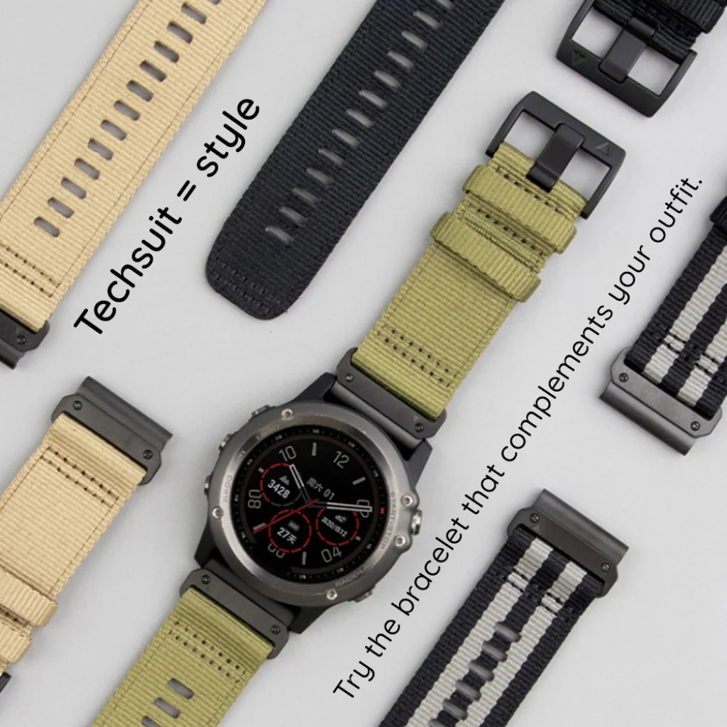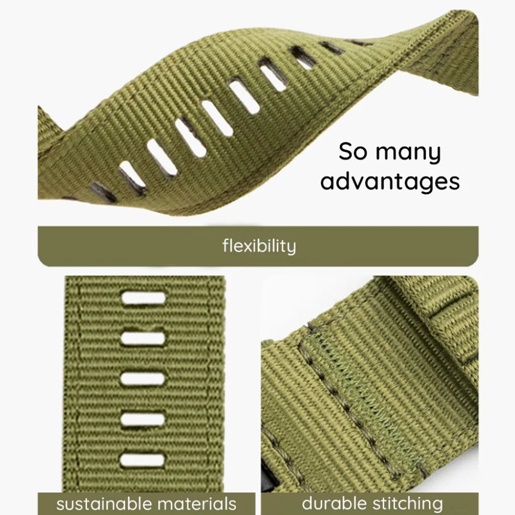 - Strapabíró, szövött anyag: A kiváló minőségű textil anyagból készült szíj ellenáll a mindennapi kopásnak és az extrém körülményeknek egyaránt. Rugalmas, mégis robusztus felépítése garantálja a hosszú élettartamot, és segít szembenézni minden kihívással, legyen szó sportolásról, túrázásról vagy más kalandról.
